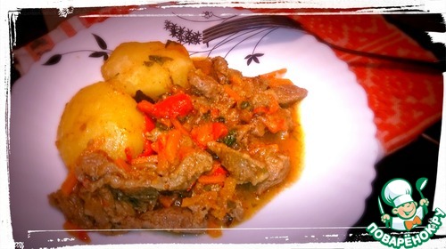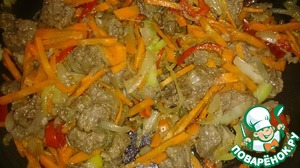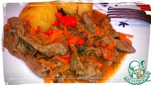К мясу добавить лук ( из маринада), морковь и болгарский перец. Жарить овощи с мясом минут 5-7. Обжаренный картофель добавить к мясу и овощам, залить 500 мл. горячей воды, добавить аджику. Накрыть крышкой, и тушить на медленном огне 15-20 минут. За пару минут до готовности, добавить зелень и измельченный чеснок.