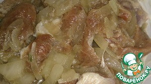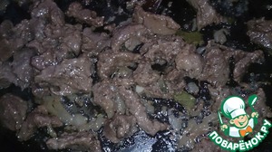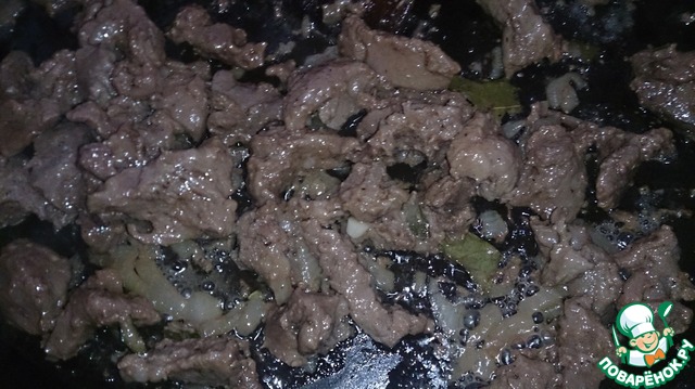 Мясо выкладывать без лука. Лук убрать в сторону. Убавить огонь, и накрыть крышкой. Мясо пустит сок.