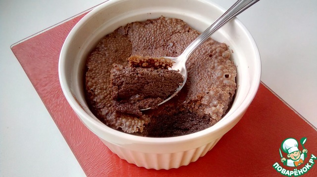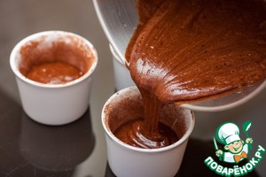 Смажьте сливочным маслом одну большую форму с отстегивающимся бортиком (диаметром 23 см) или 6 керамических порционных формочек (я готовила половину нормы, поэтому формочек 3). Присыпьте какао-порошком. Лишний порошок стряхните, перевернув формы вверх дном.
