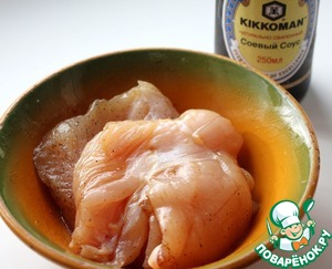 Филе куриное поперчить и посолить по вкусу, сбрызнуть растительным маслом и 1 ст. л. соевого соуса. Поставить в холодильник мариноваться на 1 час.