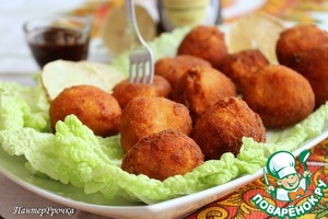 Если у кого нет фритюрницы (как у меня например): беру кастрюльку с толстым дном, лучше казанок. Чем меньше диаметр дна, тем лучше, потому что экономнее расходуется масло. Масло наливаю толщиной слоя примерно 2 см и обжариваю шарики с 2 сторон. Получаются как будто жареные во фритюре, и не отличишь внешне, но зато экономия масла приличная. По необходимости масло доливается в казанок во время жарки. Спасибо автору за рецепт! Блюдо не осталось без внимания!