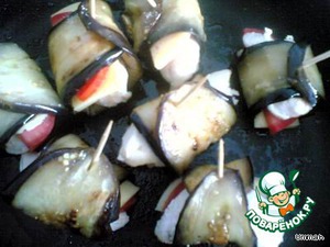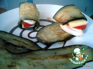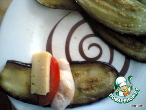 Уложить кусок куриного филе, томат и сыр на пласт обжаренного баклажана.