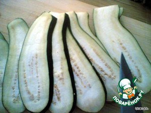 Вдоль нарезать баклажан тонкими пластами, примерно 5-6 мм.