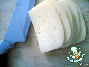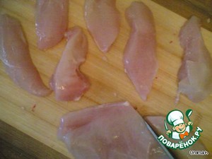 Сыр нарезать такими же размером кусками, какими получилось обжаренное филе курицы.