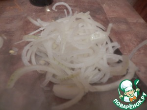 Лук залив небольшим количеством уксуса (примерно 3 ст. л.) настаиваем пару минут, после чего промываем холодной водой.