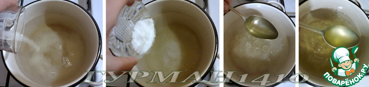 В кастрюльку наливаем 1 литр воды, добавляем 100 г сахара, 2 чайные ложки соли и 50 мл растительного масла.
