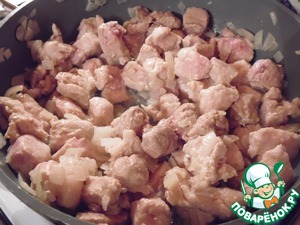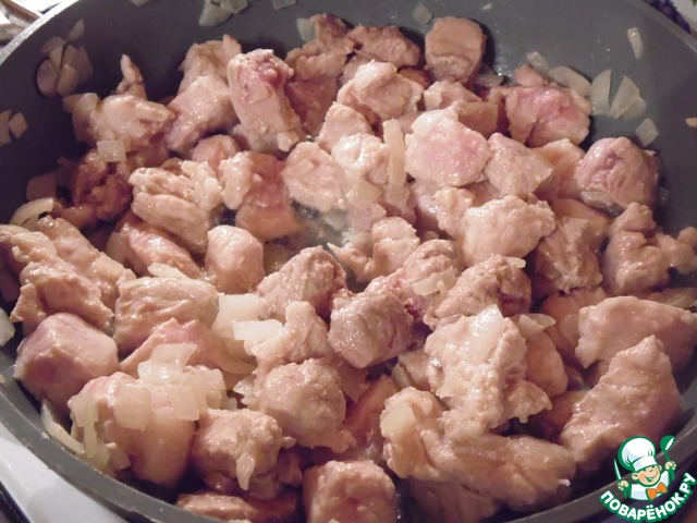 • Мясо нарезать кубиками, добавить к луку, залить бульоном, тушить на медленном огне 25 минут.