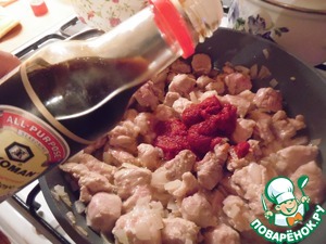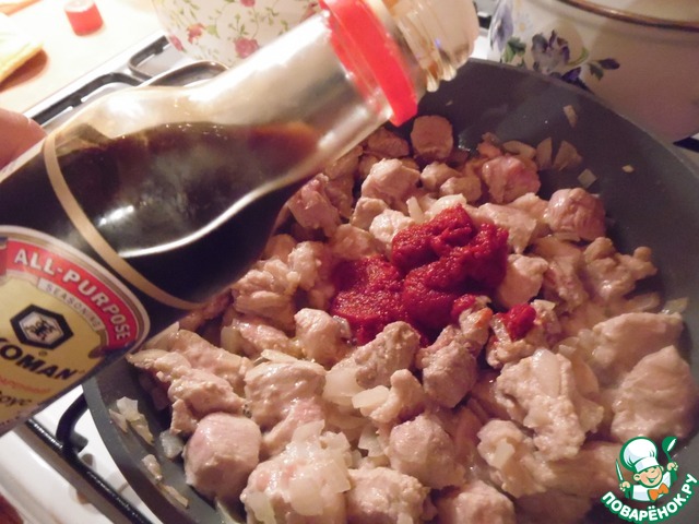 • К мясу добавить томатную пасту и соевый соус ТМ "Kikkoman", тушить 10 минут.
