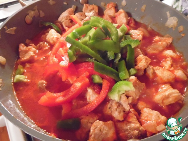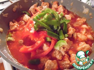• Перец нарезать полосками, добавить к мясу, тушить 5 минут.