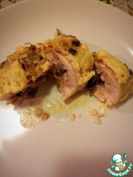 Далее раскладываем на поверхности грибы с луком (можно сразу разделить грибную массу на 8 порций и тогда хватит на все бёдра одинаковое кол-во начинки).