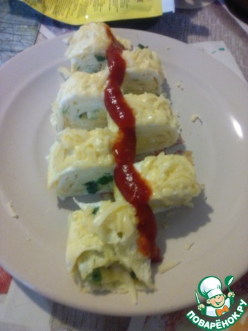 Секрет - сворачивайте рулет пока блин не совсем поджарился, тогда омлет не будет сухим.