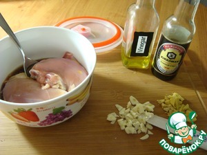 Курицу замариновала на ночь. Она вкусней. Можно замариновать и на пол-часа. Помыла, сняла кожу, обсушила. Выложила в посуду с крышкой. налила соевый соус, положила сахар, соль и перец. Порезала мелко чеснок и имбирь. Отправила туда же, накрыла крышкой, хорошо встряхнула и отправила в холодильник.