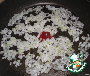 Лук режем мелко и жарим на растительном масле до золотистого цвета.