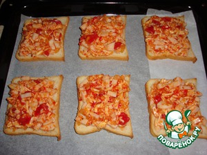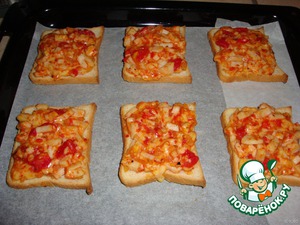 Противень выстилаем пекарской бумагой или фольгой. И выкладываем намазанные начинкой тосты.