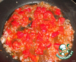 Помидоры очищаем от кожицы и режем кубиками. Отправляем к луку на сковородку.