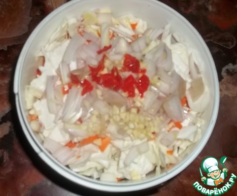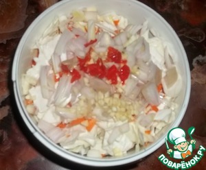 Перец чили мелко порубить, лук и чеснок нарезать произвольно, добавить к капусте.