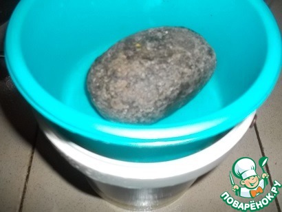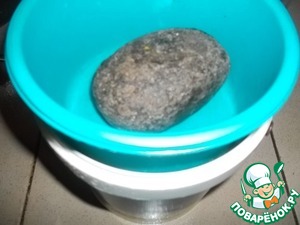 Залить капусту кипящим маринадом и поставить под груз на 12-14 часов; вот такую конструкцию я соорудила, оставила на ночь, утром сняла груз и убрала в холодильник.