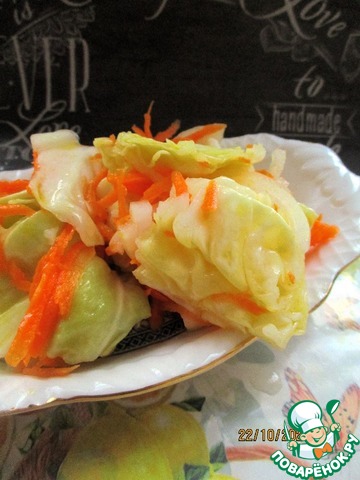 Хороша эта капуста не только на закуску, отличный гарнир к мясу в сочетании с картофелем или просто с кусочком черного хлебушка (рекомендую тем, кто на диете, на ужин). Мне особенно нравится то, что капуста выходит невероятно хрустящая, не слишком соленая, чуть остренькая, рассол можно пить стаканами... А главное, быстро и просто! Вроде именно такой рецепт на сайте не нашла, если ошибаюсь - поправьте.