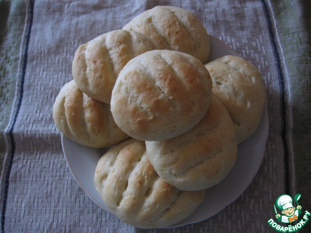 Из теста формируем колобки размером с крупное яблоко. Выкладываем на противень, застеленный бумагой для выпечки. Каждый колобок немного приплюснуть. По каждому хлебцу сверху прочертить 3-4 полоски острым ножом. Дать постоять 5-10 минут и отправить в духовку, разогретую до 180 градусов.