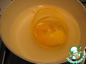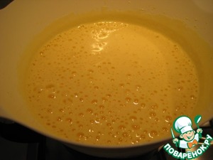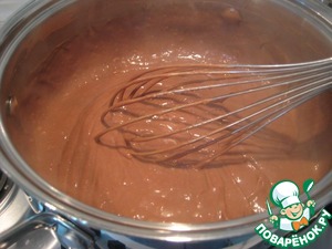Какао процедить через ситечко, влить тонкой струйкой в желтки не переставая взбивать. Массу перелить в сотейник, варить 5 минут, постоянно помешивая венчиком до загустения.