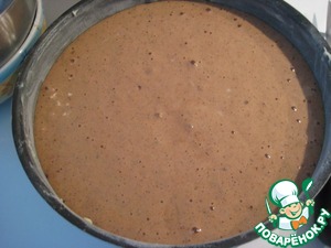 Форму диаметром 28 см смазать кусочком мягкого сливочного масла, присыпать мукой, излишки муки стряхнуть. Перелить тесто в форму, выпекать 25 минут, готовность проверить деревяной шпажкой.
