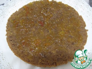 Нижний корж кисточкой пропитать апельсиновым сиропом, смазать тонким слоем джема,