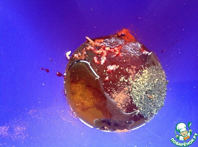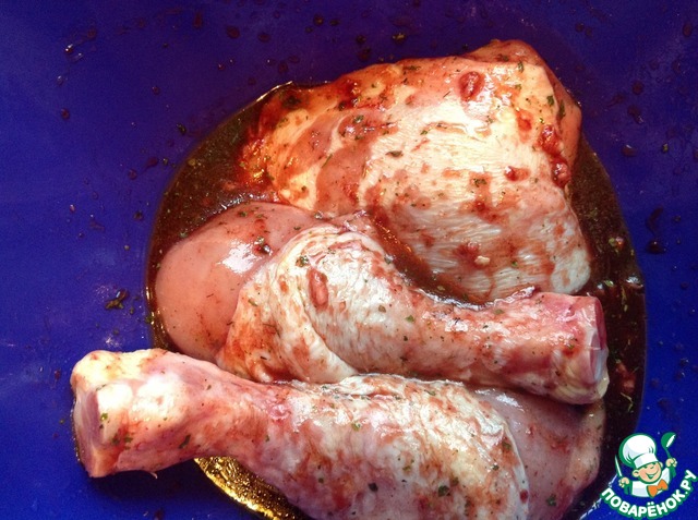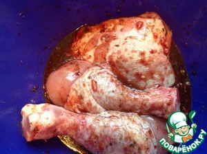 Окорочка разрезать на голени и бедра. Замариновать и оставить на час.