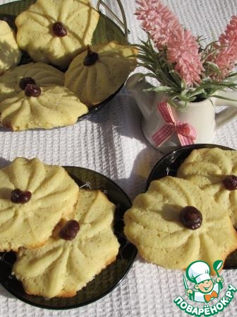 Из кондитерского мешка или пресса для печенья отсадить печенья, серединку декорировать капелькой джема.