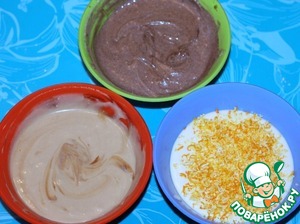 Тесто разделить на 3 части. добавить в первую миску - кофе растворимый, во вторую - какао-порошок и в третью - цедру апельсина, отдельно перемешать.