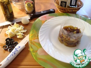 Берём кольцо, чтобы красиво выложить салат в тарелку. Если у вас его нет-не беда!!! Разовое кольцо можно вырезать из пластиковой бутылки, как сделала в данном случае я. Выкладываем в кольцо содержимое сковороды. Яйца мелко рубим, маслины режем на кружочки, петрушку тоже мелко режем.