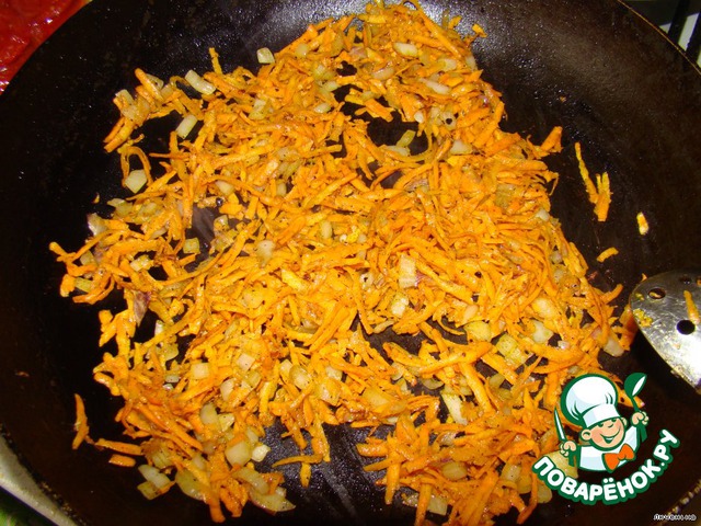 Трем на терке морковь и режем лук, тушим на постном масле и тоже добавляем в сырок.