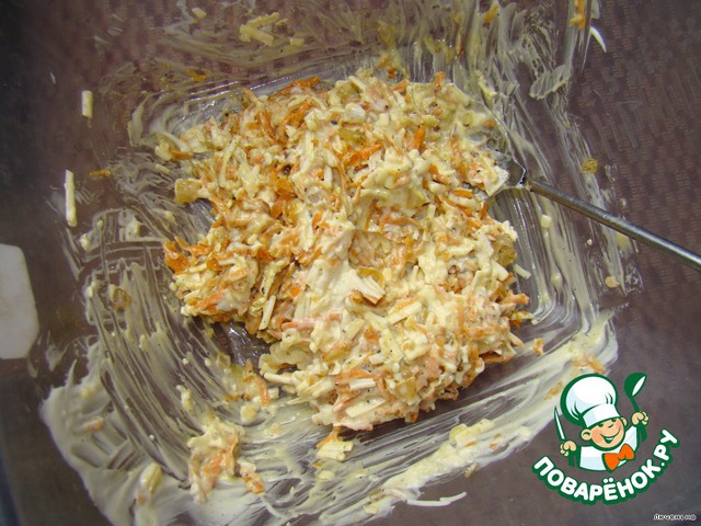 Добавляем в сырок и морковку, майонез, перемешиваем, начинка готова!