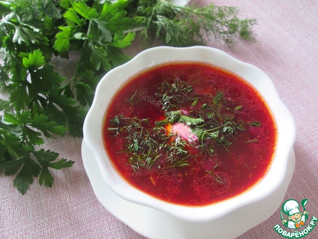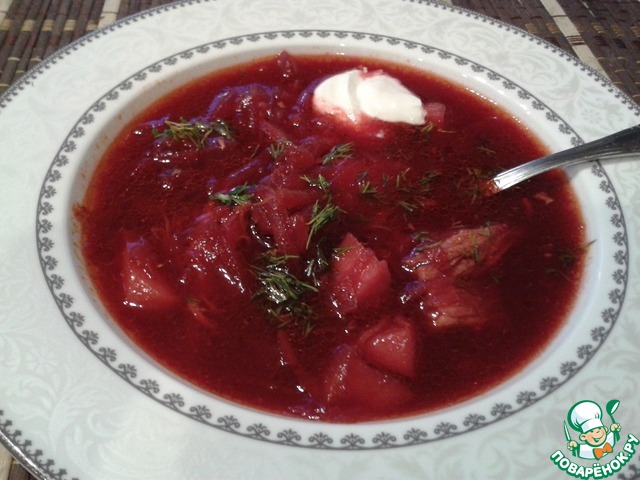 И так, закрепляем материал, если вы решили приготовить настоящий городской борщ вам необходимо четко выполнить всего несколько правил. Это! Иметь в наличии 4,5 л. бульона, морковь с луком, приправой, уксусом и томатным соусом томленые примерно 40 минут, которые после, надо будет одновременно с картофелем варить ровно 10 минут, затем, туда же добавить уже отварную и натертую свеклу, хмели-сунели, чеснок и уксус, довести до кипения, посчитать ровно до пяти, и немедленного снять с огня! Ну, и вот, такая тарелочка борща по-городскому вам обеспечена!