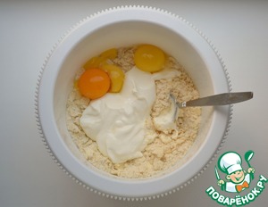 Добавить яичные желтки и сметану, ванильный сахар. Перемешать.