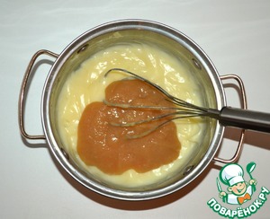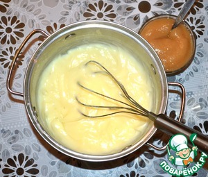 - Ванильный пудинг смешать с сахаром, влить холодную воду. Размешать, чтобы пудинг полностью растворился. Варить на небольшом огне около 5 минут (до загустения), постоянно помешивая венчиком.