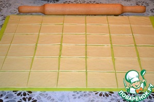 Тесто раскатать в прямоугольник толщиной 2-3 мм. Разрезать тесто на сегменты размером 7х8 см.