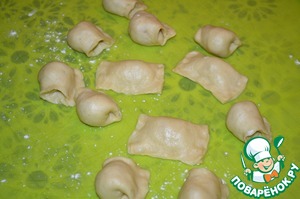 На каждую заготовку выложить по половине чайной ложки начинки. Сложить тесто пополам. Защипнуть с трех сторон. Снова сложить заготовку пополам, защипнув тесто с 2-х сторон. Получается подушечка.