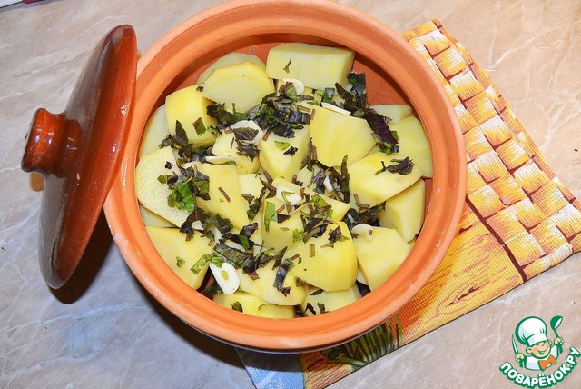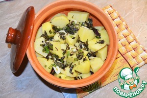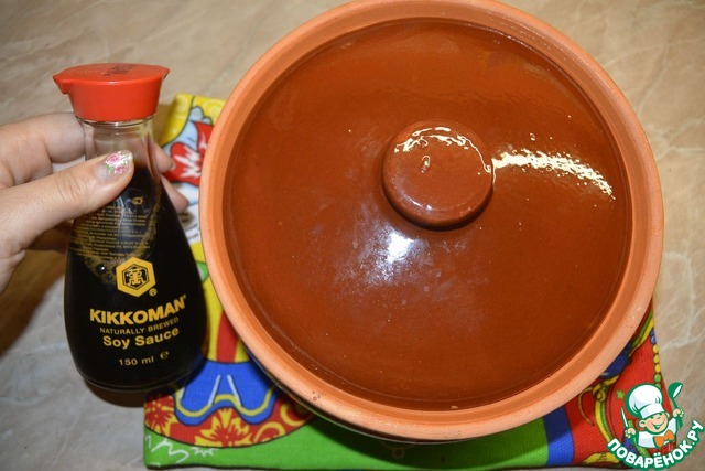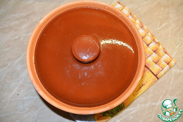 Закрыть крышкой и поместить в разогретую духовку до 200С на 10-15 минут. Потом прикрутить огонь до 180С и тушить дальше до готовности. У меня в электрической духовке при конвекционном режиме, на средней полке, заняло 20 минут с момента прикручивания огня. Мой горшочек на 1,5 л. Если у вас маленькие горшочки, то время естественно сокращается.