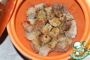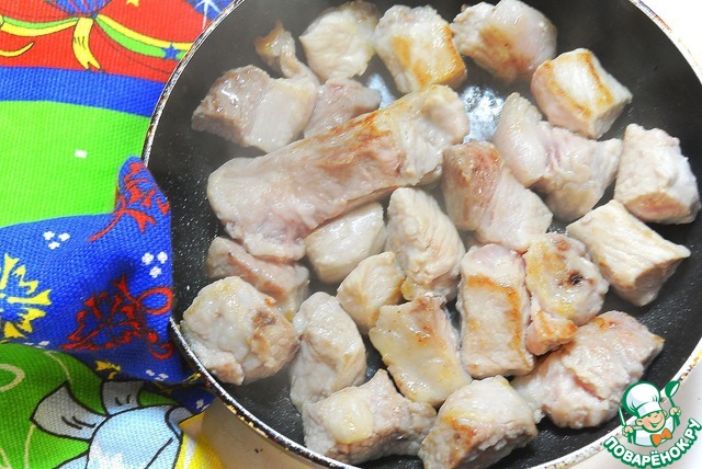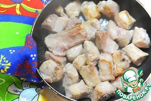 Мясо нарезать на кусочки примерно 3см и слегка обжарить на растительном масле.