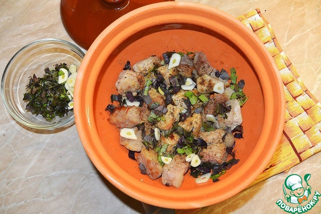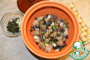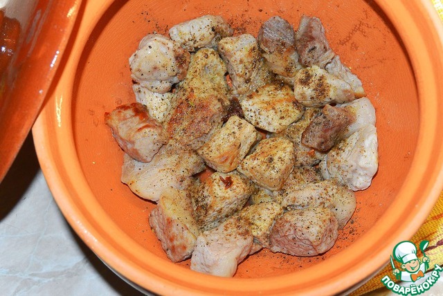 Выложить обжаренное мясо на дно горшочка. Слегка посолить и поперчить.