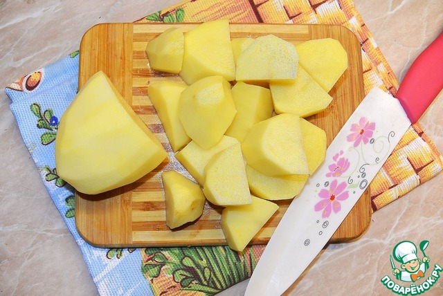 Картофель почистить и нарезать на произвольные кусочки, которые должны быть больше мясных кусков.