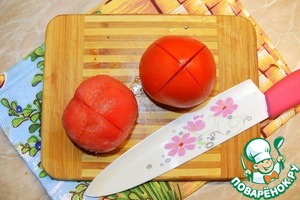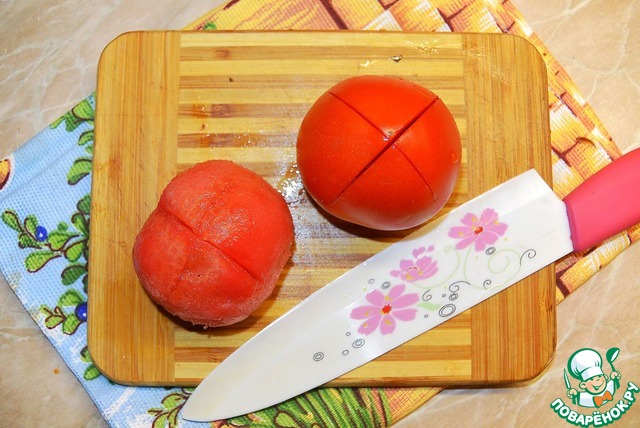 Помидоры надрезать верху в виде креста и обдать кипятком. Подержать минуту. Потом опустить в холодную воду и они легко очистятся от шкурки.