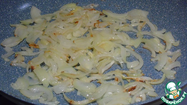Лук нарезаем полукольцами и обжариваем на растительном масле до золотистого цвета