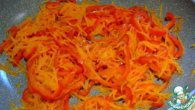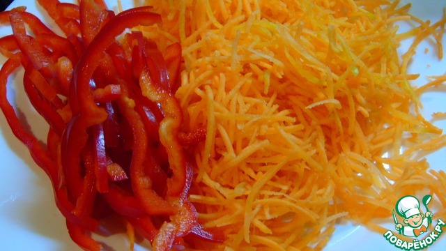 Морковь натираем, красивее всего на терке для корейской моркови, перец болгарский нарезаем соломкой