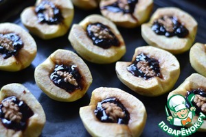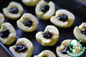 Противень застелить бумагой. Выкладываем яблоки, джемом вверх.