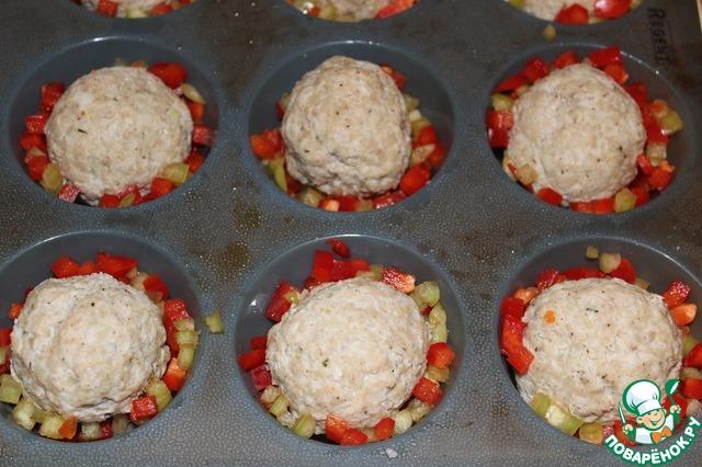 В каждое углубление добавить нарезанный кубиками сладкий перец по краям. -