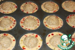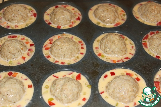 Шумовкой достать тефтельки из воды и уложить по одной в смазанную растительным маслом форму для кексов. ( У меня силиконовая форма).