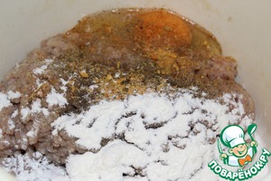 В фарш вбить яйцо, добавить муку, соль и перец. -