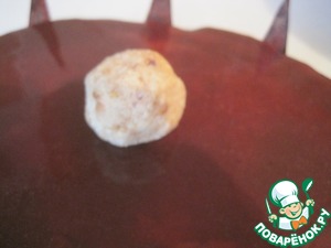 На торт кладем шарик, сделанный из боковых крошек бисквита смешанного кремом.