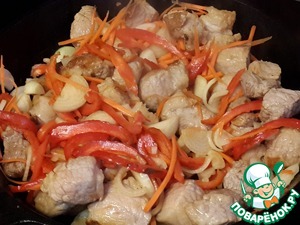 Итак раскалите сковороду, обжарьте кусочки свинины со всех сторон, затем добавьте овощи и обжаривайте еще 5 минут -